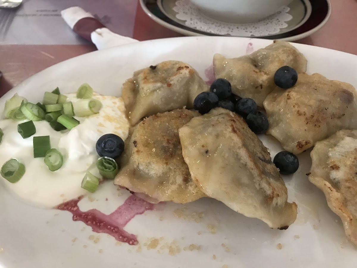 I was just looking for a place to sit and enjoy the weather when I saw the tables in the alley way. I love Greek food so decided to try a few different dishes. I've never had sweet perogies before so had to try the blueberry ones. They were so good! I also tried the Greek salad with gyro meat which was piled so high I had to move half to a separate plate. The tzatziki sauce was always amazing. Server was really kind and the atmosphere in that alley was so peaceful. I'll definitely go back!